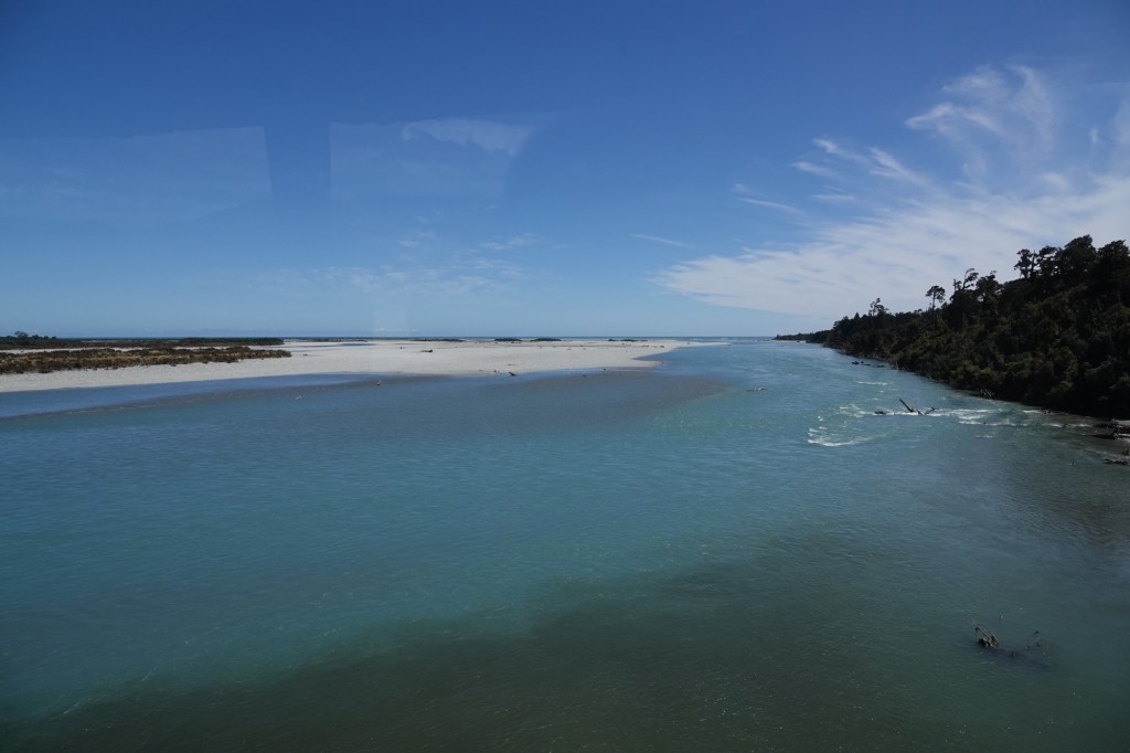 We crossed the Haast River via the longest single lane bridge in NZ. Trevor and Mike asked us to imagine crossing it during flood season (spring: Sept/Oct) when the snow melts off the Alps and the currently almost dry river beds are covered with so much water that the bridge can actually flood. Annual rainfall here is almost 4 metres per year, added to the snow melt ! As a comparison, on the east side of the island average annual rainfall is only around 1-1.5 metres. Right now at the height of summer the rivers are at their lowest levels.