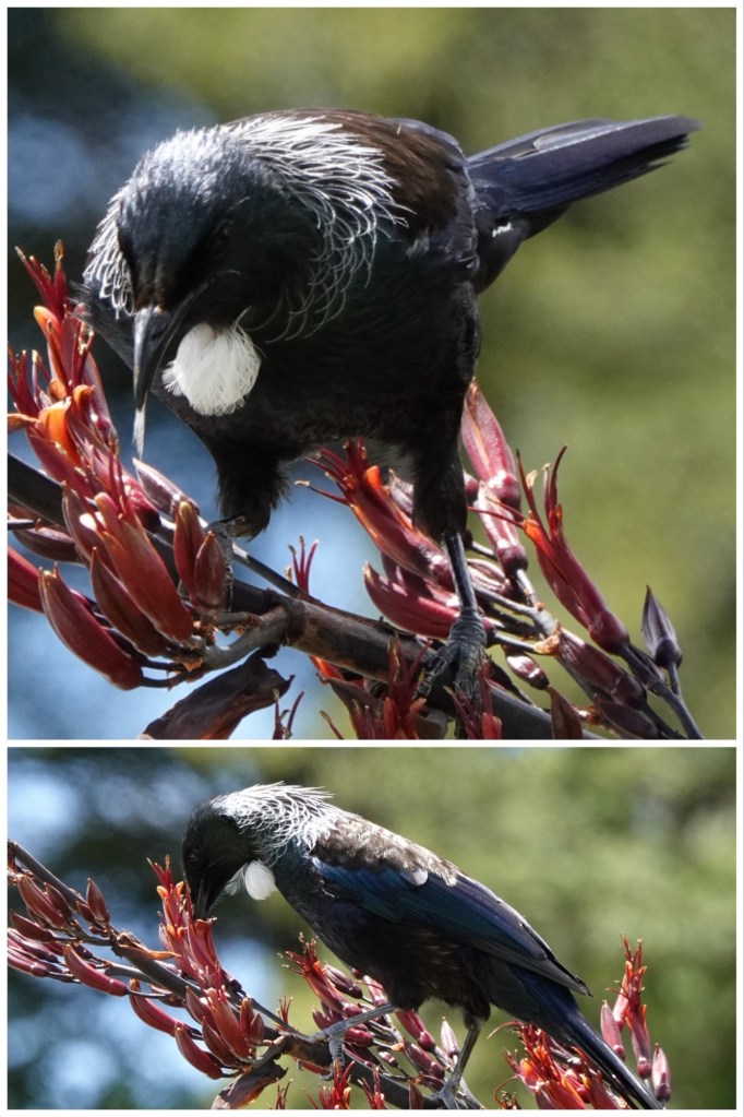 All around us was the melodic sound of the New Zealand tui. Ted finally captured a photo of one later at our Makarora comfort stop.