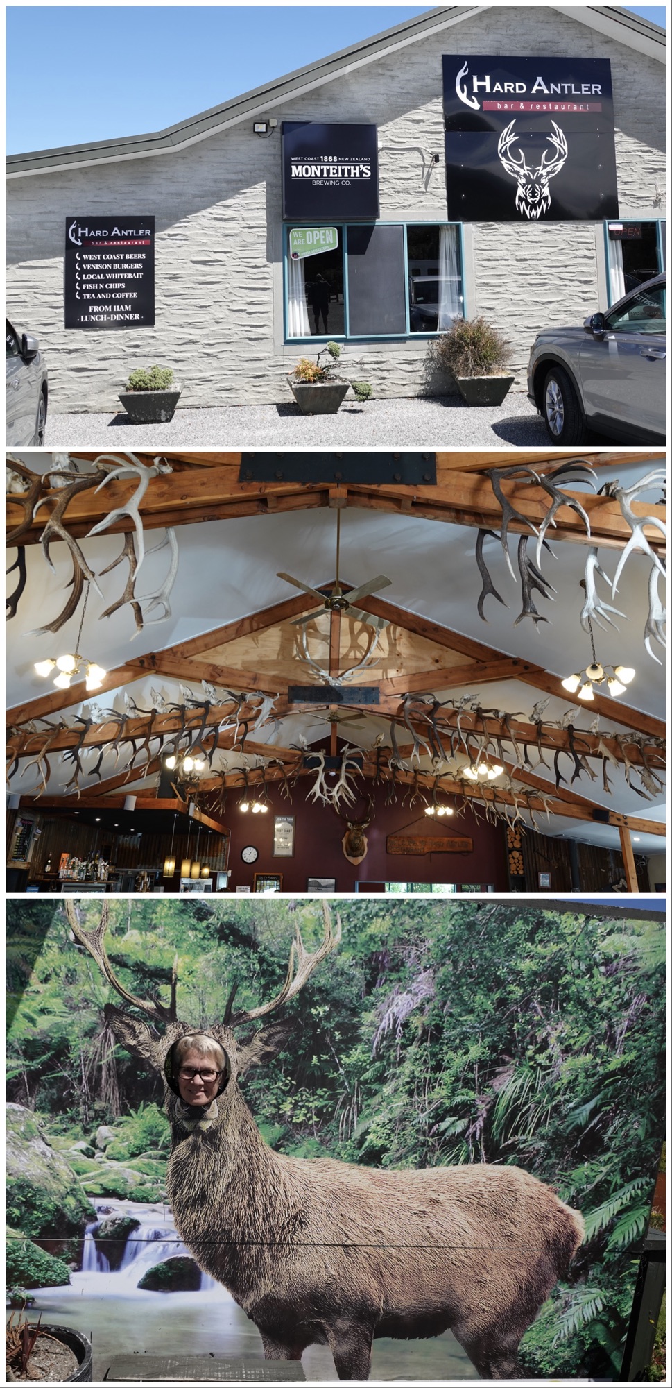 We made a comfort stop at Makarora, which has become an area known for deer farming. Deer were originally brought to NZ by colonists for sport hunting, and soon went feral and became a real problem. One of the strategies to combat being overrun by deer was to capture them and domesticate them. That capture was done initially by “helicopter cowboys” who rappelled down from helicopters, lassoed and hog-tied the deer, and airlifted them onto farms. More recently the process has been made a little less exciting by simply dropping a net from the helicopter.