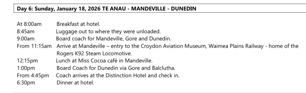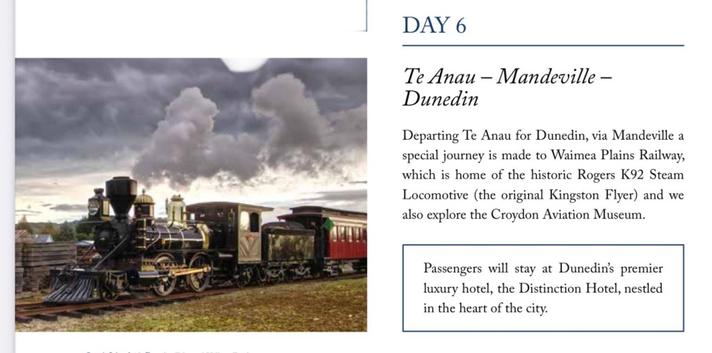 Ted commented last night that we had more coach travel and less train travel than he’d expected on this tour, and rightly so. Our train stretches are short, while the distances being covered by coach are long. (Back to yesterday’s blog about the large area of the south island versus its small population;passenger trains are just not economically – nor topographically – feasible in this mountainous, sparsely populated place.)