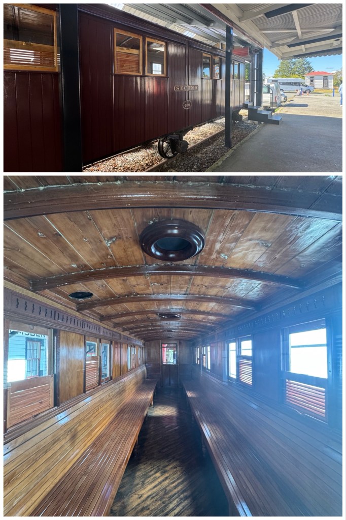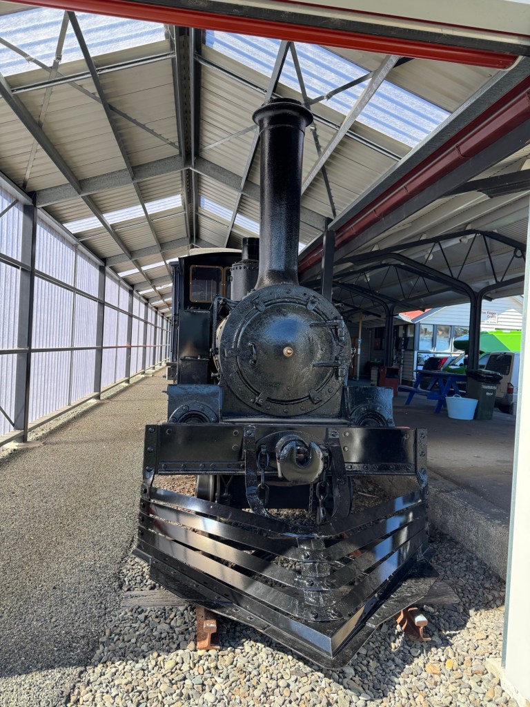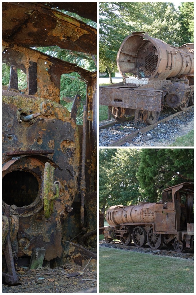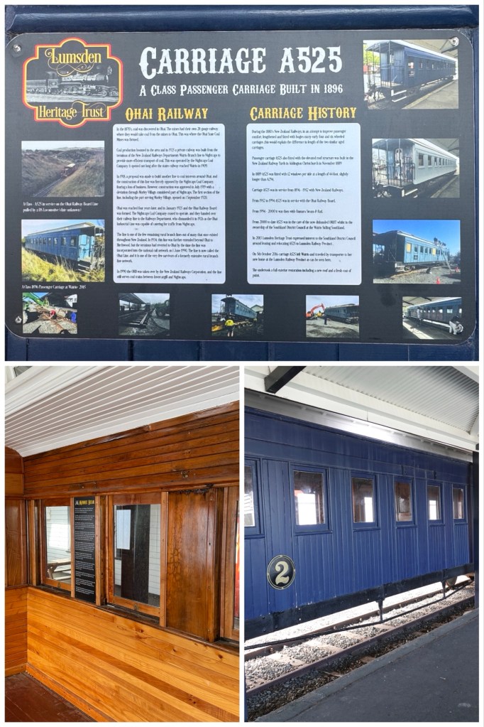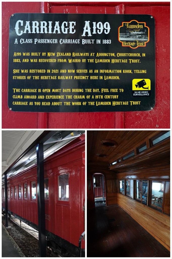At our Lumsden coffee/comfort stop we saw both a restored locomotive with train cars in a shed, and an unrestored train that was recovered from the river in 2019 by the Lumsden Heritage Trust . The two 1885 V-class steam locomotives were pulled from the Oreti River, where they were dumped as flood barriers in 1928. After years of campaigning, the trust used heavy machinery to extract V-126 and V-127, which are now displayed at the Lumsden Railway Precinct as a major tourist attraction, alongside other restored rail items like the A199, 525,and 100 carriages.