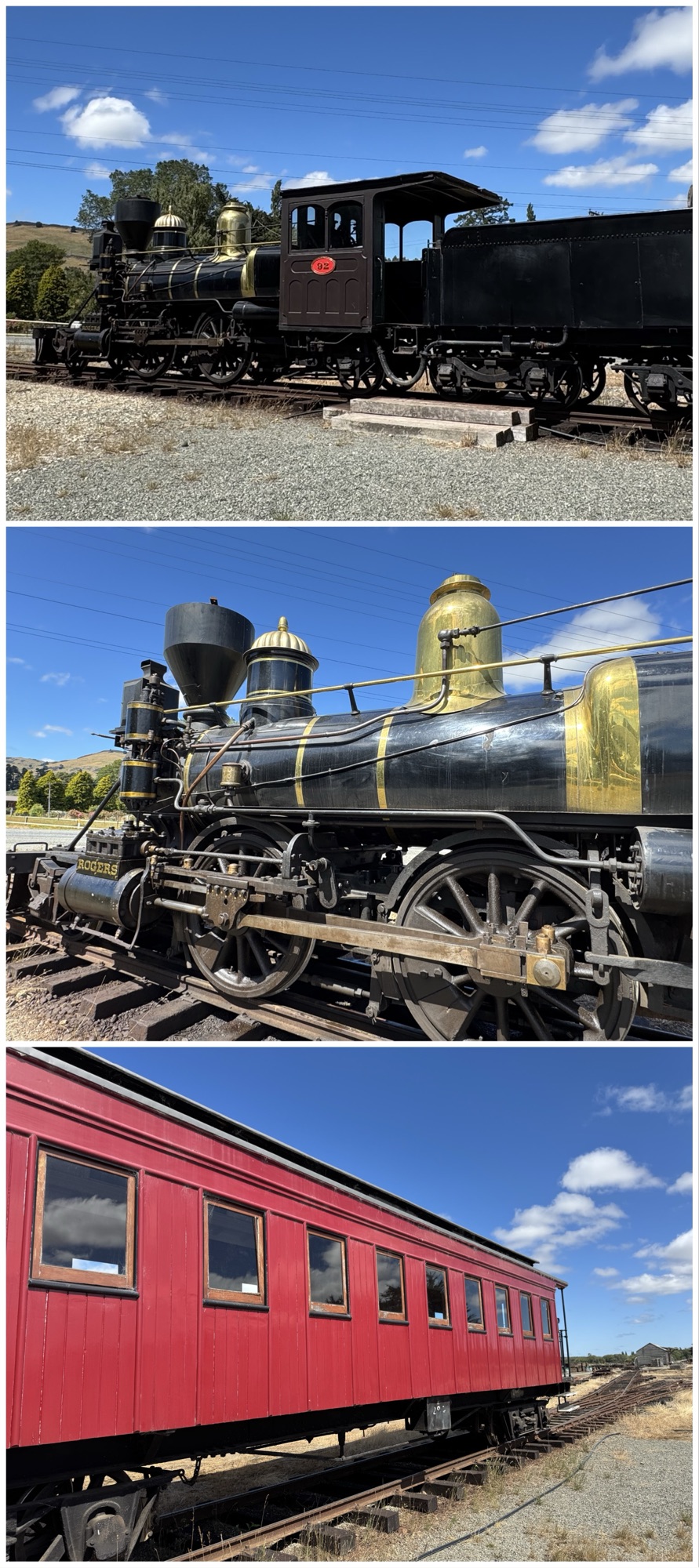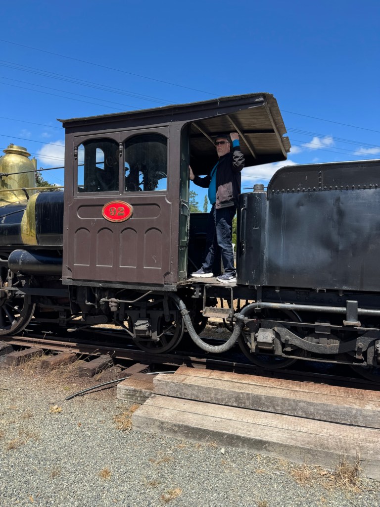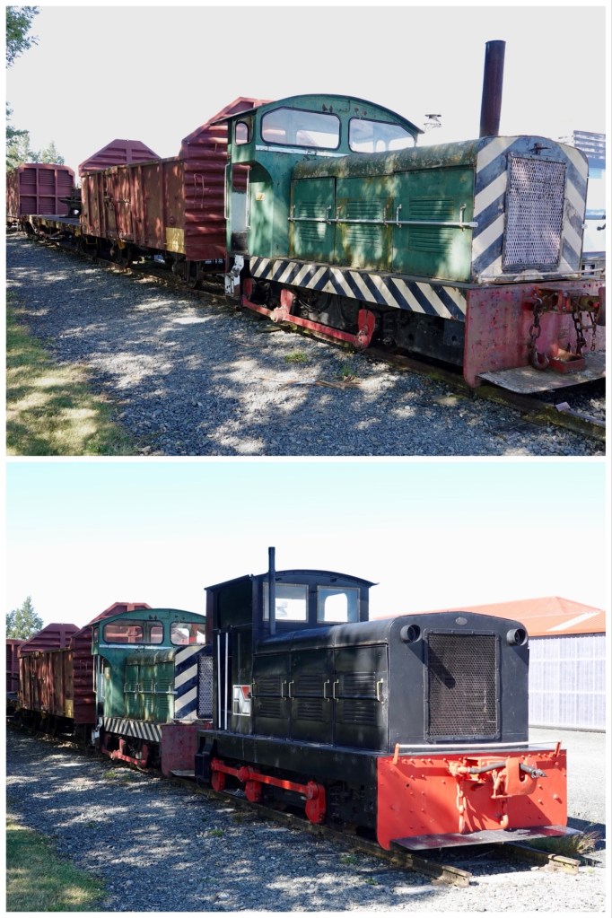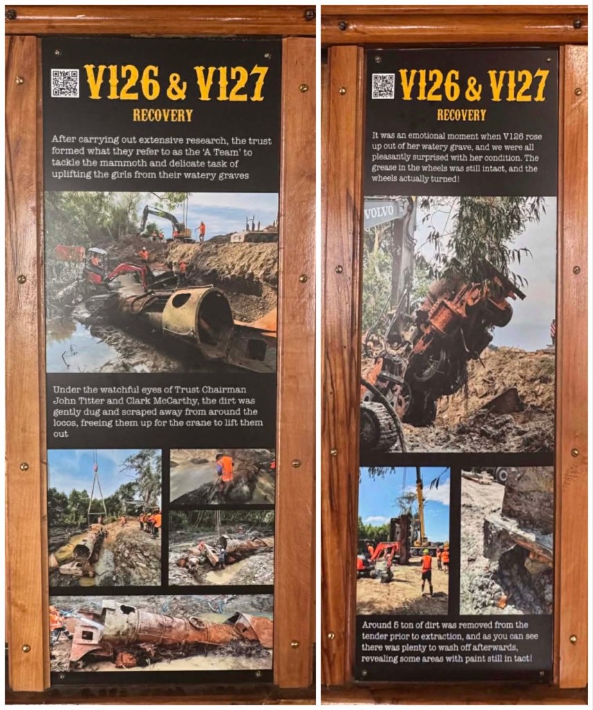 At our Lumsden coffee/comfort stop we saw both a restored locomotive with train cars in a shed, and an unrestored train that was recovered from the river in 2019 by the Lumsden Heritage Trust . The two 1885 V-class steam locomotives were pulled from the Oreti River, where they were dumped as flood barriers in 1928. After years of campaigning, the trust used heavy machinery to extract V-126 and V-127, which are now displayed at the Lumsden Railway Precinct as a major tourist attraction, alongside other restored rail items like the A199, 525,and 100 carriages.