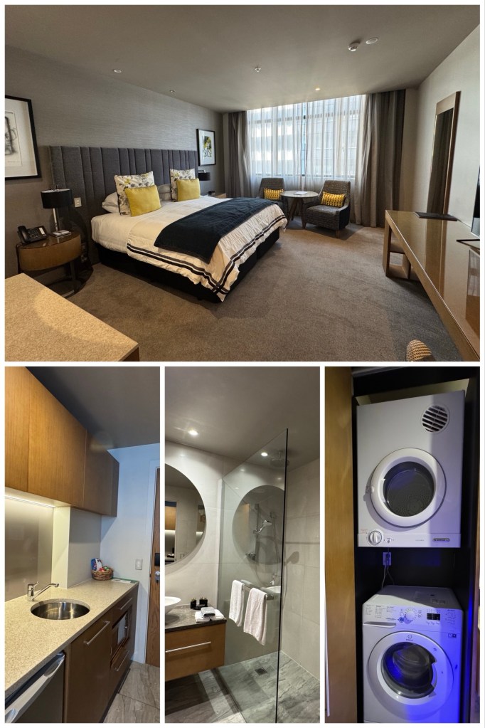 For the next two nights we’re at the Distinction Hotel in Dunedin, where our dinner was delicious, featuring (among other things) some wonderful roast lamb with rosemary jus, and passion fruit Pavlova for dessert.