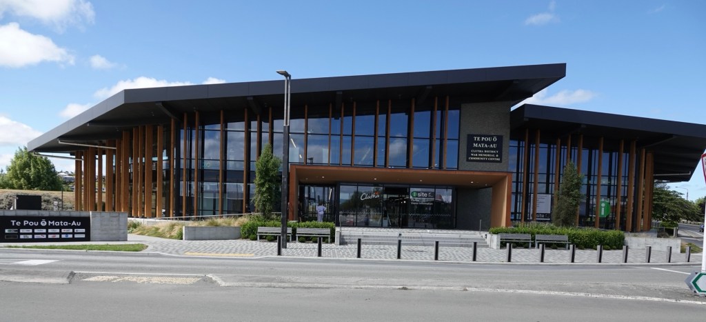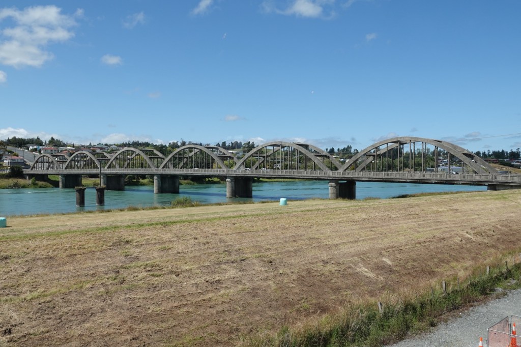 From inside the Balclutha Community Centre (our source of chocolate covered jaffa orange ice cream!) we got a great view of the bowstring design concrete arch bridge over the Clutha, which is the second longest river in NZ at 338 km/210 miles.