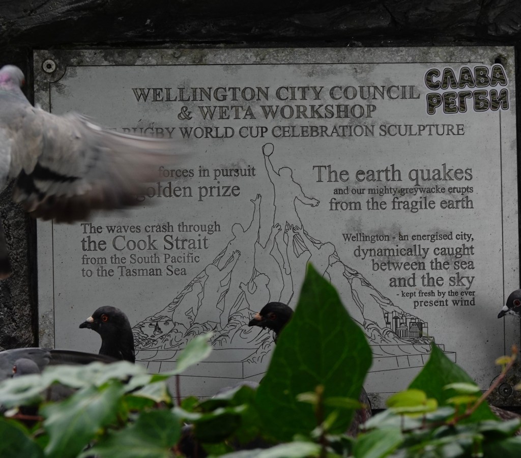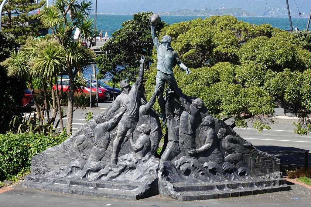 The sculpture depicts two clashing rugby teams rising in low-relief style from the Cook Strait (where the waves from the Pacific Ocean meet the waves of the Tasman Sea). At the peak of the sculpture, in full figurative style, a victorious player reaches for the burnished bronze rugby ball.