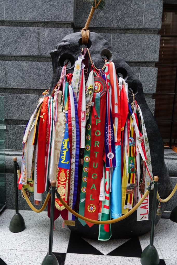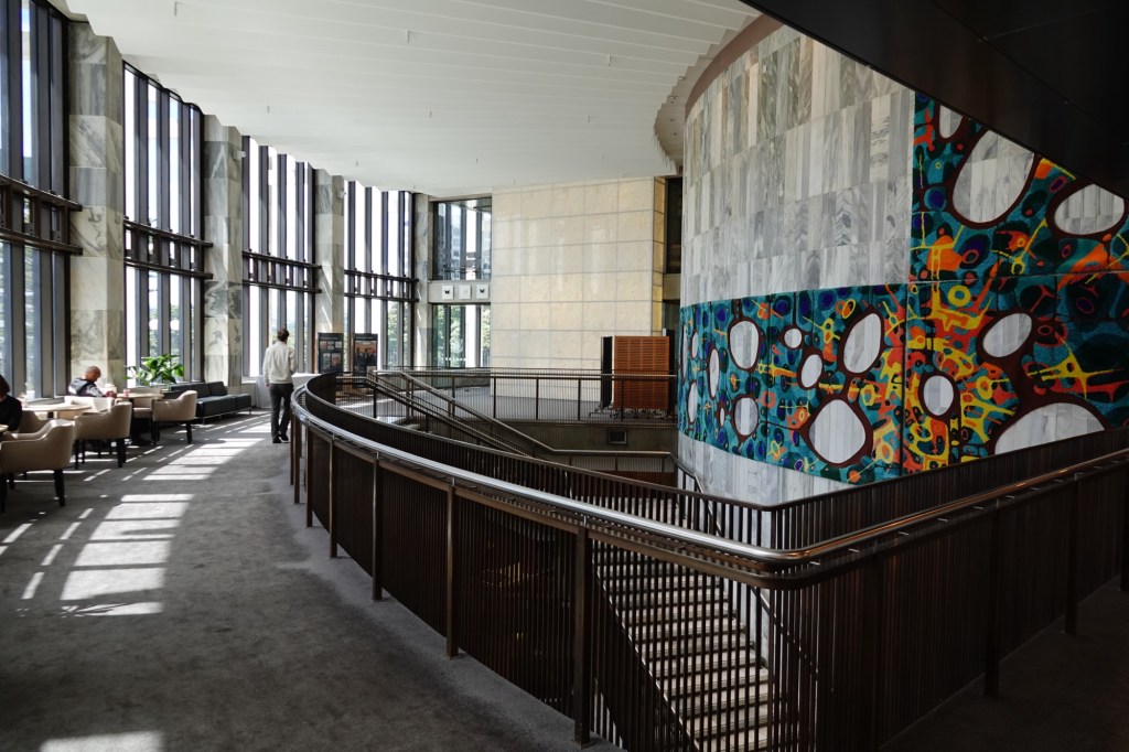 We began in the newest of the three buildings, “The Beehive”. Designed by a British architect from sketches he made in 1964, it was completed between 1969 and 1979. The 72m/236ft tall building has 12 floors above ground and 2 below, with the Prime Minister’s office on the 9th floor and the Cabinet Room on the 10th. There was very little of this building open to the public.