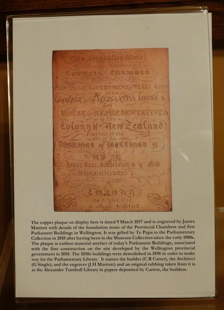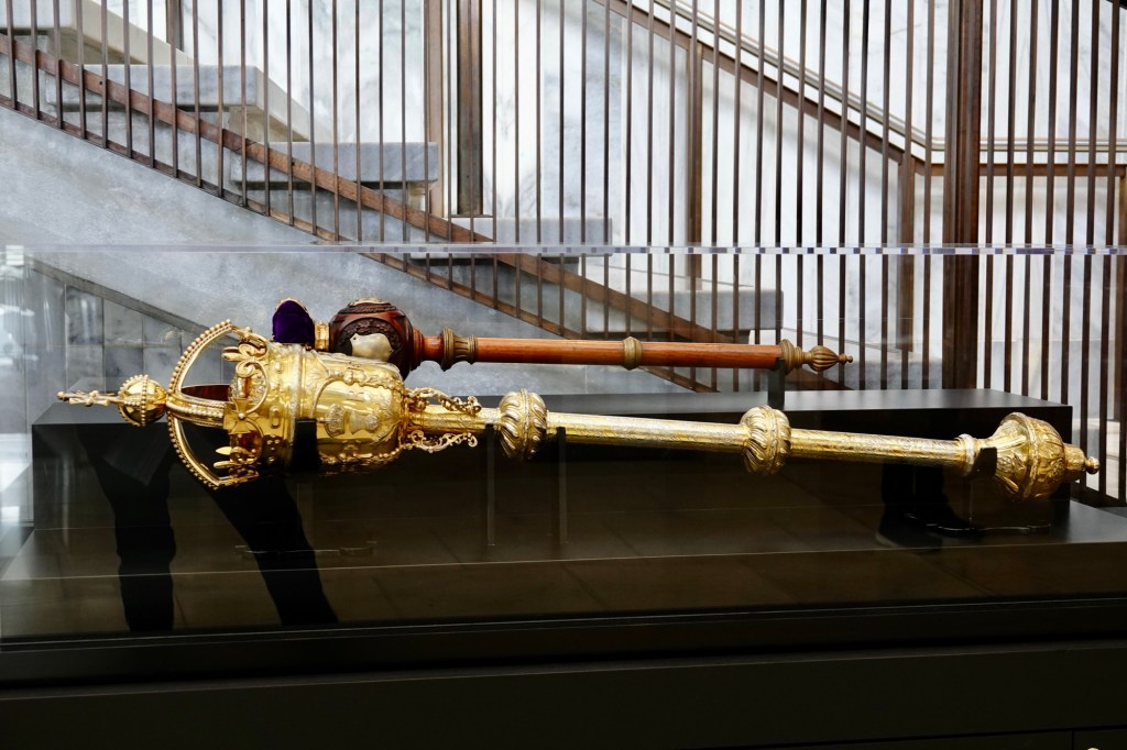 If parliament had been sitting, in the place where there was an image of the Speaker of the House’s mace there would have been the actual mace. Ted got a picture of it in its glass case in the foyer of The Beehive.