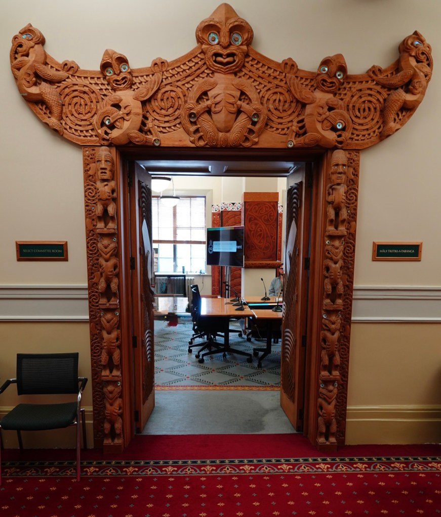 Once back in Parliament House, there was one more treat in store. Since parliament was not sitting in this lead-up week to Waitangi Day, we were able to visit one of the seven Select Committee Rooms. These rooms are used for the day-to-day work of small groups of MPs writing or refining legislation. We visited Māui-Tikitiki-a-Taranga, the Māori Affairs Select Committee Room, adorned with carvings and tukutuku (woven wall panels) that represent the four winds (iwi/tribes from across NZ) being bound together by kōwhaiwhai (painted rafter patterns).