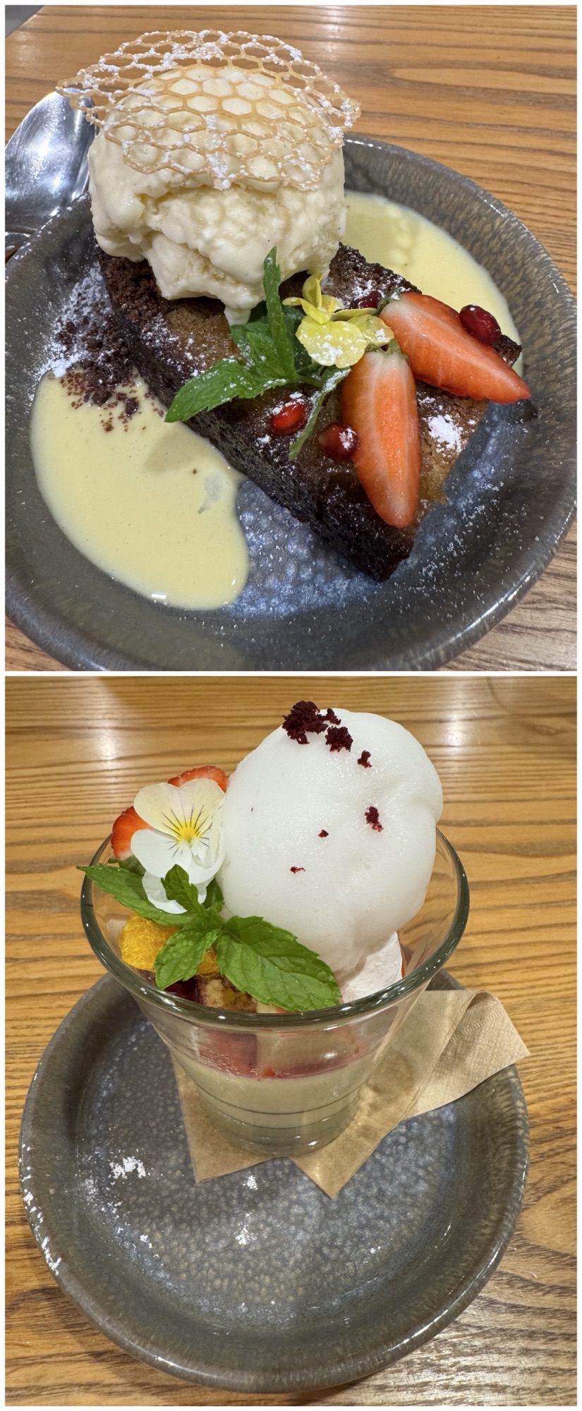 We topped dinner off with two amazing desserts: malva pudding (served with crème anglaise, vanilla ice-cream, and tuile) and raspberry and lemon posset (with orange almond bites, freeze-dried mandarin, and lemon sorbet)