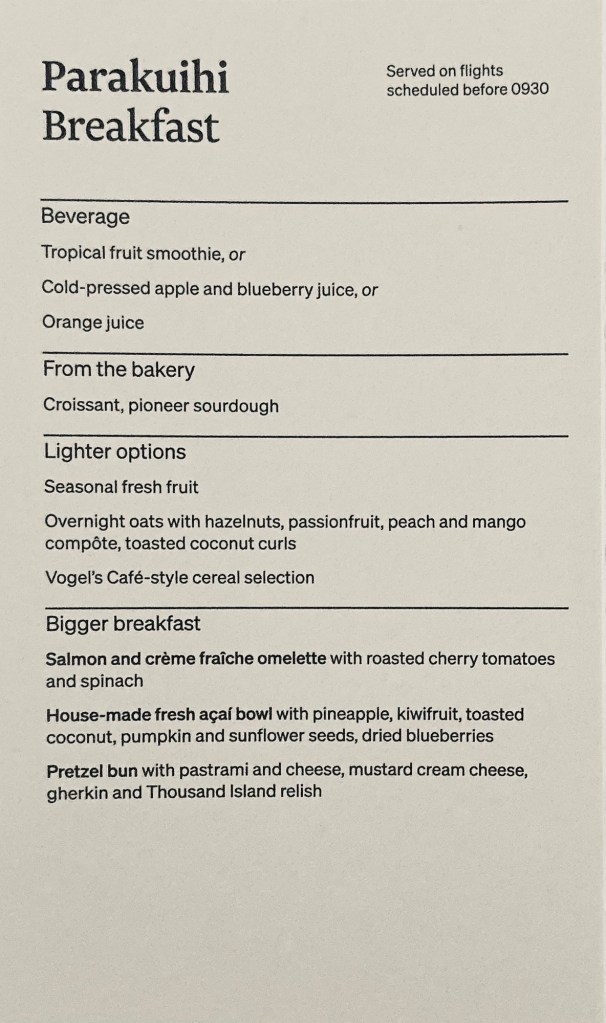 The menu offerings for our morning flight were breakfast options; I almost wished we’d been scheduled on a later flight with the wonderful lunch options that included manuka honey-glazed lamb and an affogato-inspired ice cream dessert, which would have given me one more opportunity to enjoy New Zealand dairy.