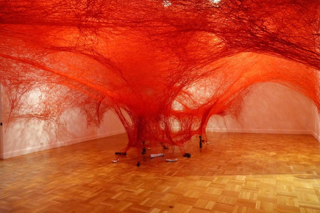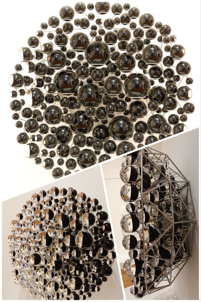 The huge work (below) made of glass spheres silvered only on half of their surfaces was fascinating because of the way it changed from every angle. Looked at directly, the spheres appeared to be solid black, but as we walked past it, we could see various angles of reflection, until the spheres looked clear.