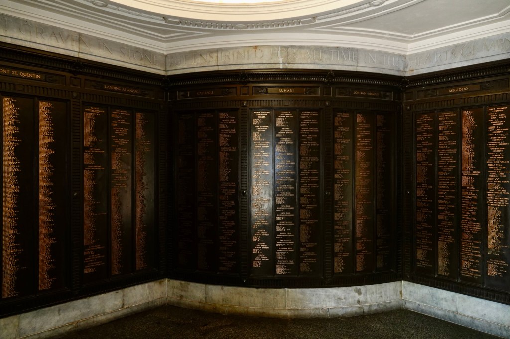 The record room inside the memorial houses honour rolls listing the names of the more than 5500 South Australians who died in the war. The inscription circling the inner chamber of the memorial reads: 1914 to 1918 men of ANZAC. Their glory survives in everlasting remembrance, not graven in stone, but in shrine for all time in the hearts of men.