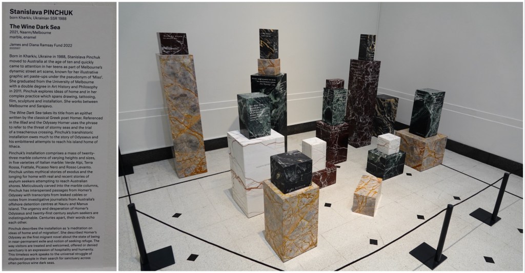 The pictures we took inside show just how varied the collection here is. There is definitely a focus on Australian and modern artists, although of course there are works from famous Europeans too. The latter we have seen many times, so we focussed on the former. As usual,the photos represent the pieces I particularly enjoyed or wanted to remember.