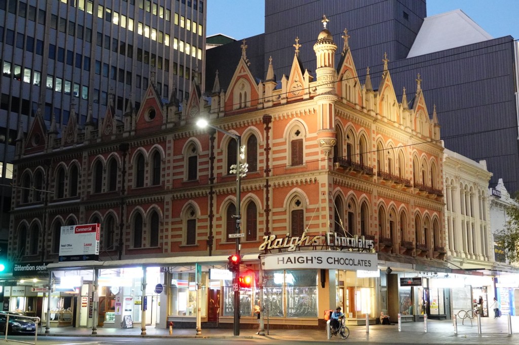 Last night we took one of what will undoubtedly be many walks along Rundle Mall, hoping to take photos of some of the beautiful Victorian era buildings without the daytime shopping crowds. This street was Australia’s first pedestrian mall, created in 1976. At 520 m (1,710 ft) long it is the largest pedestrian mall in the southern hemisphere.