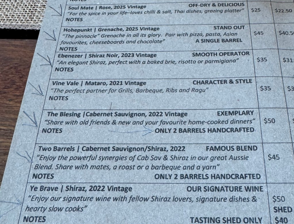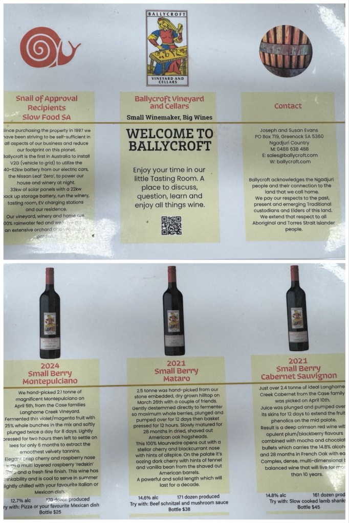 A bit of research via GetYourGuide, Viator, and Expedia led us to a company called South Australia Wine Tours and a small group (maximum 8) tour focussed on family-owned premium wineries where the tastings are led by the winemakers themselves. These aren’t big name Australian wineries. In fact, their small batch wines are only available at their cellars.