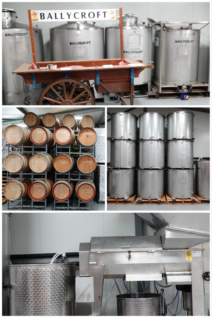 Ballycroft has all new vines; there is no heritage root stock here. As was the case at Hart of the Barossa, the grapes are “dry grown” and 100% hand picked. The grapes then go into a crusher/de-stemmer that is designed to be so gentle that the 85% of the de-stemmed grapes come out still whole. Fewer exposed seeds during fermenting means fewer tannins, which may be why I liked these reds even more than some of the others we’d tried. After 10-12 days of fermentation, the grapes are slowly pressed. The gentle pressing process takes 10-12 hours. After that, the wine goes into stainless steel tanks for 10 days before being finished in oak for 3-4 months.