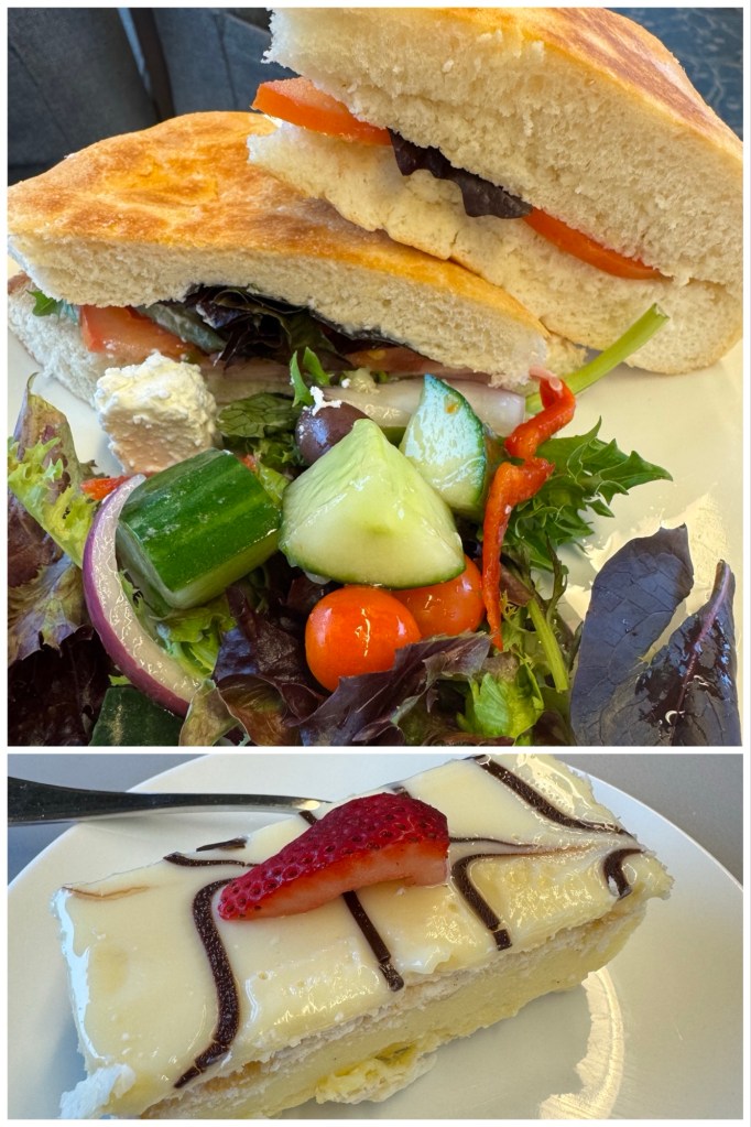 Just past Bordertown we were served our lunch: a sandwich combining fresh warm focaccia with crisp cold ham and vegetables, with a side salad, followed by a cool delicious vanilla cream slice as dessert.