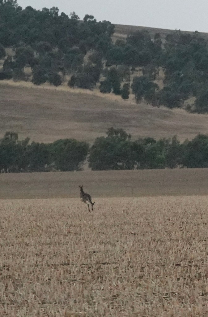 Early in the trip we saw, but missed photographing, a few lone kangaroos sitting under trees avoiding the rain. Later on, as we sped by at 90kph/55mph, Ted managed to capture a single roo bounding across a field.