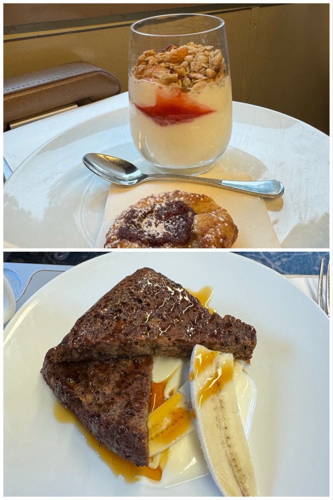Our breakfast plates rattled a bit ominously on our tray tables, but Ted’s yogurt parfait and pastry, and my grilled banana bread with syrup and lemon yogurt were both tasty – although we had to be careful eating them in order not to wear them.