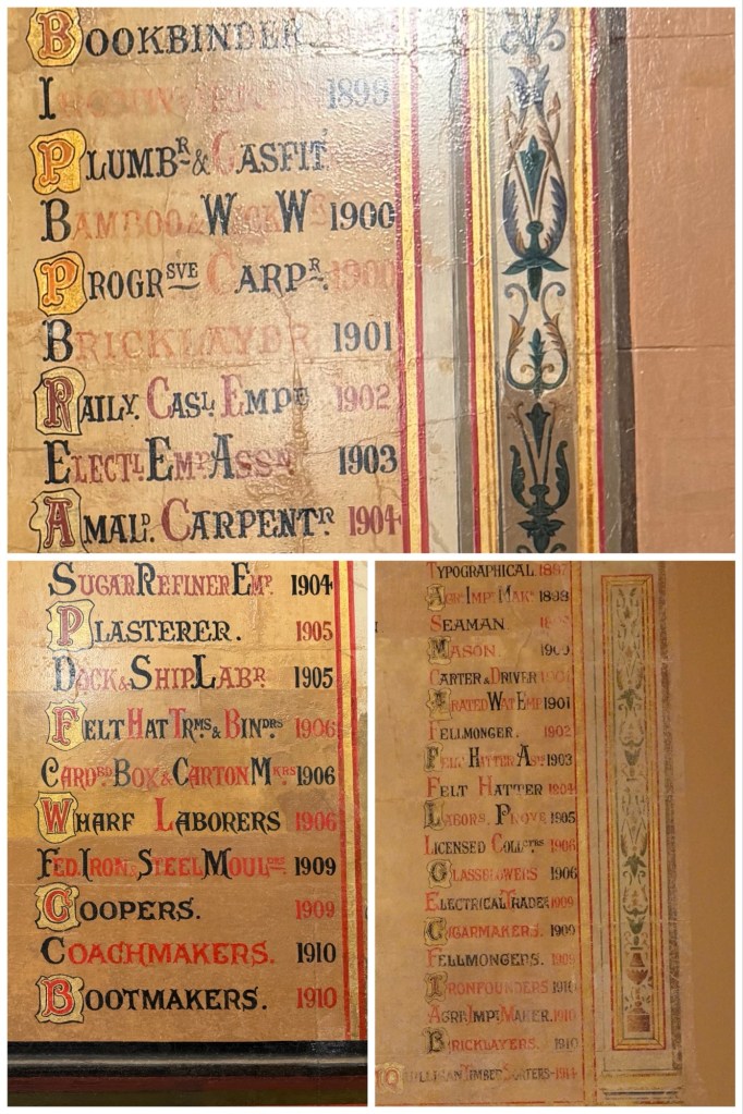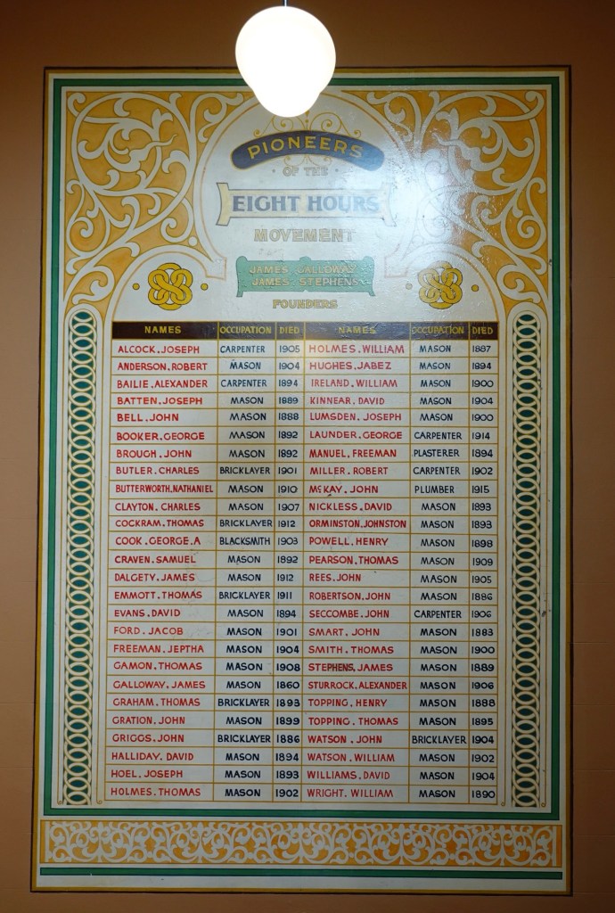 The trades represented in the 19th century when the 8 hour work day was being fought for included many that don’t exist today, like “Bamboo & Wick Workers”, “Fellmongers”, and “Felt Hat Trimmers & Binders”.