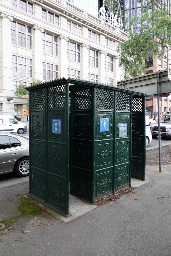 A Victorian era men’s toilet on Flinders Street. Inside, hidden from public eyes, a trough/drain with water constantly running into it down the wall.
