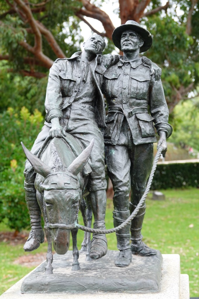 The plaque under this statue read: PRIVATE JOHN SIMPSON 3rd PA AIF. AFTER THE LANDING AT GALLIPOLI SIMPSON WITH HIS LITTLE DONKEY WORKED ALONE DAY AND NIGHT TAKING WATER TO THE FRONT LINE AND CARRYING THE WOUNDED BACK TO THE DRESSING STATIONS. HE AND HIS DONKEY WERE KILLED BY A SHRAPNEL SHELL ON 19-5-15.