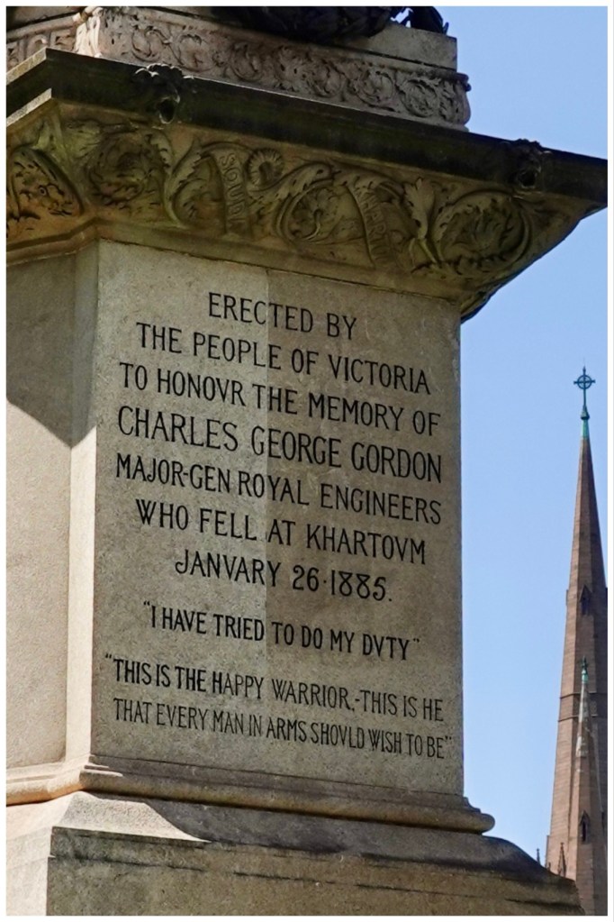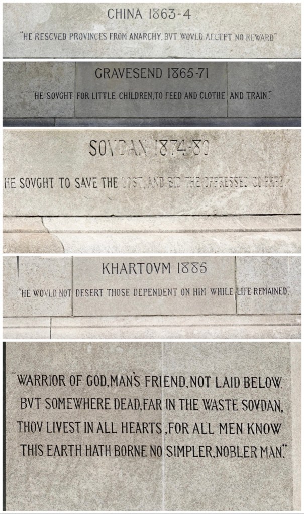 I don’t think we have ever seen a monument that expressed so much admiration for the person depicted as we saw on the one below. Each side of the plinth expressed admiration for wartime deeds in each of the arenas in which Major General Gordon fought.