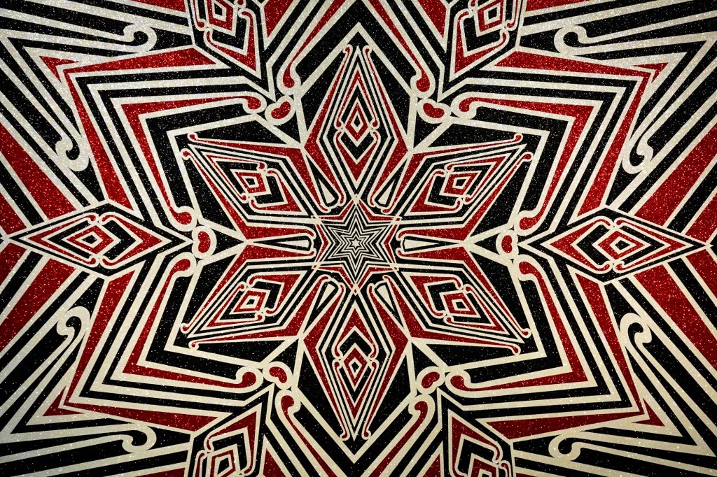 draws on the traditional Mãori Kowhaiwhai (pattern) the Puhoro, commonly used in thigh tattoos for men and women. The Puhoro depicts the wake of a waka (canoe) moving through the water as well as the wearer’s whakapapa (genealogy). Rendered in Paterson’s signature glitter – a reference to the artist’s childhood experiences of the glistening waters and sparkling black sand beaches of Tamaki Makarau’s west coast. A crucifixion rearticulates and extends Maori expression into the present.