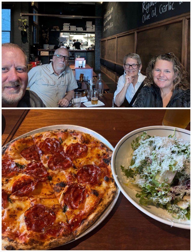 We continued on to our dinner destination: drinks and pizza with Bill and Meg Nyland, who I “know” through Bill’s blog How Bill Rolls. It’s been one of the big bonuses of our trip so far that we’ve had the flexibility to meet other world travellers. As Meg expressed, they’re easy meet-ups to have because we start from a common understanding of a lifestyle that embraces constant travel.