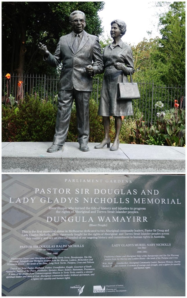 One of the reasons I’m a big fan of statues, especially those accompanied by explanatory plaques, is that they attract attention. Had we not noticed this statue, we would never have learned that this was the first memorial statue in Melbourne dedicated to two Aboriginal community leaders.