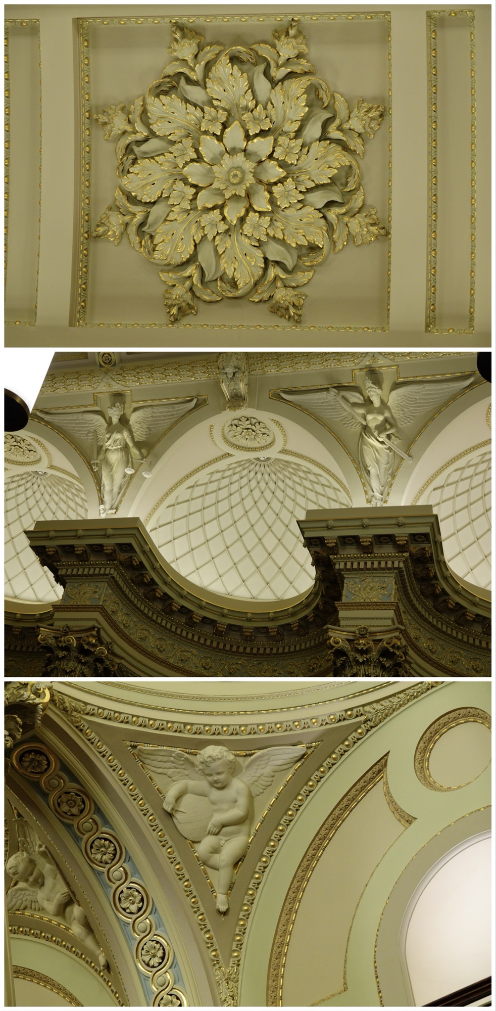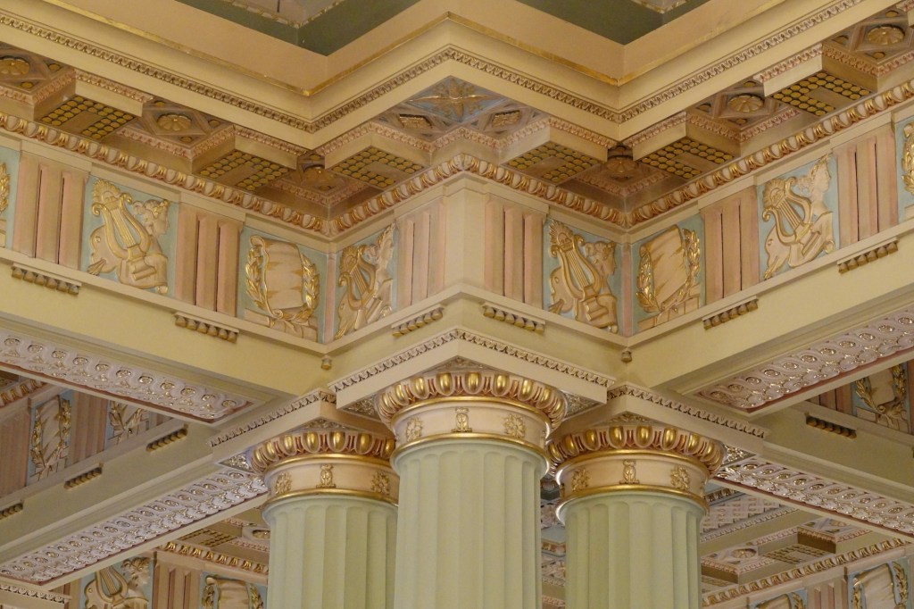 The ceiling was adorned with roses, cherubs, and a variety of angels which each depicted a virtue to be upheld by government.