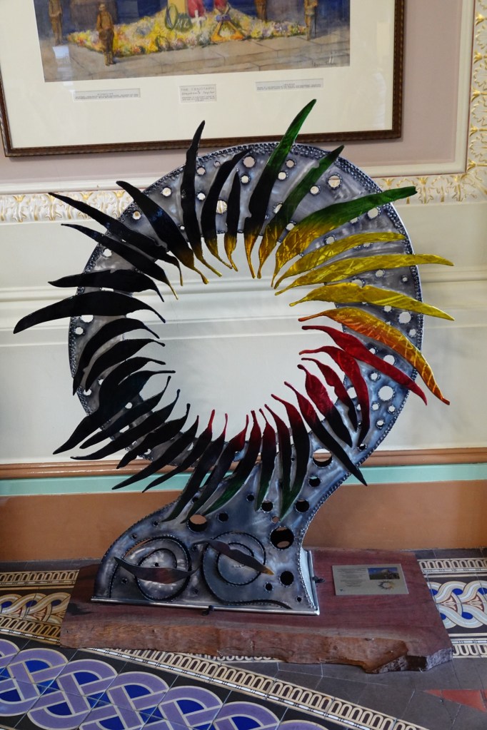 In the lobby is an indigenous memorial wreath, along with its story: “Every year since 2006 until 2019 before her passing in 19 September 2019, Aunty Dot Peters created a wreath made of gum leaves to commemorate, honour and remember the Aboriginal service men and women who served and continue to serve in The Australian Defence Force. Wayne McGinness, an Aboriginal and Torres Strait Islander man created this unique steel sculpture to honour Aunty Dot’s memory whilst respecting the original design of the Victorian Aboriginal Remembrance Committee logo, adding his own creativity to the design elements.This sculpture was a collaborative project with Aboriginal Victoria and Dreamtime Art – trusted advisors for Aboriginal and Torres Strait Islander Arts and Culture.”