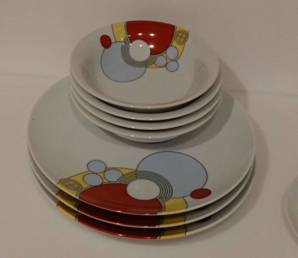 Who knew that Frank Lloyd Wright designed china patterns? “In 1916 Frank Lloyd Wright was commissioned by the Japanese government to design the new Imperial Hotel in Tokyo. The commission was one of the largest of his career and represented a new phase for Wright, as he moved away from his Prairie style towards a more organic architectural style. With his deep regard for Japanese design philosophies, Wright conceived the hotel as acting as a bridge between East and West, and as a symbol of Japan’s modernisation. This dinner service was designed for the hotel’s Cabaret Room, and the offset, abstract decoration set against the white porcelain surface reflects Wright’s deep interest in Japanese design.” Noritake produced the porcelain sets.