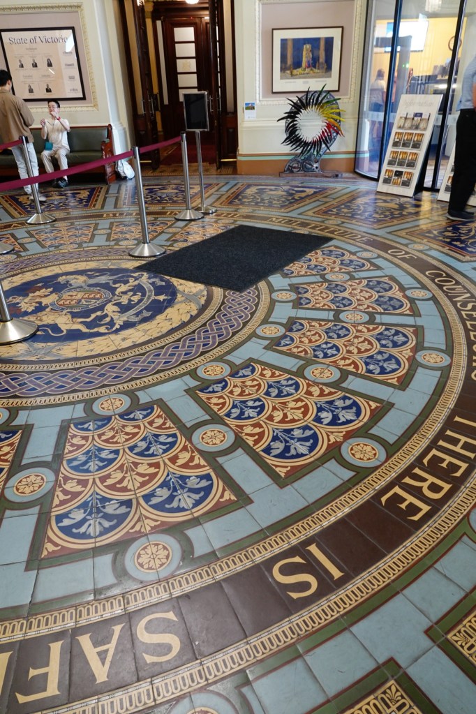 Above us (not sure how we ended up without a photo) was a chandelier composed of 2000 individual pieces of Belgian crystal. There were originally three of these in the building. Between 1901 and 1927, this building served as the meeting place of the newly created Parliament of Australia; for that period Melbourne was the temporary national capital. When the federal government moved to their new premises in Canberra, two of the three chandeliers “disappeared”, and didn’t reappear in the new Parliament Building. No one knows where they are.