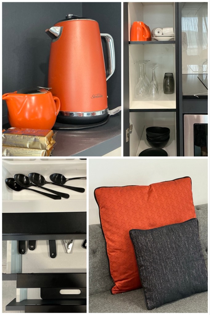 As a bonus, my OCD tendencies are completely satisfied by the clean, coordinated decor. Everything is shades of black, grey, and white, with accents of burnt orange.