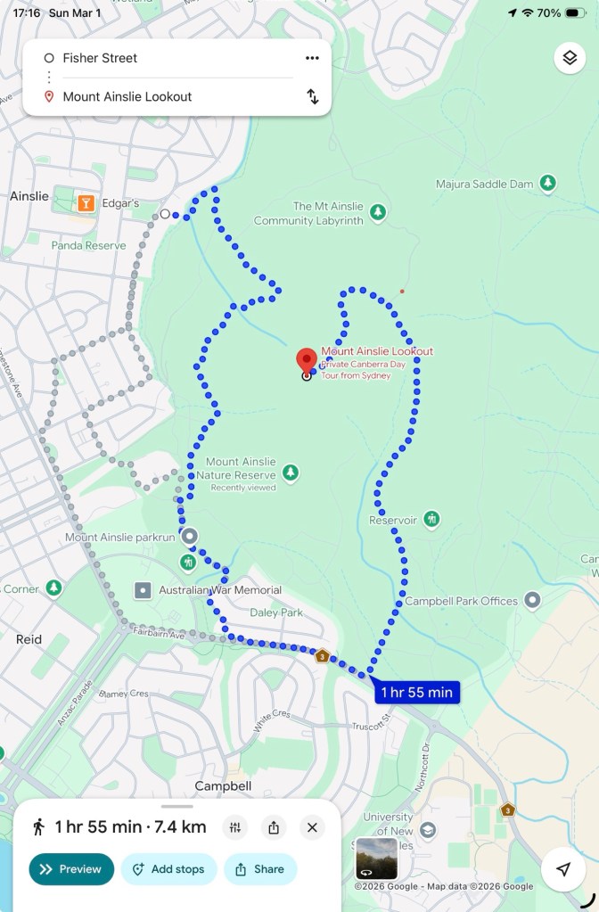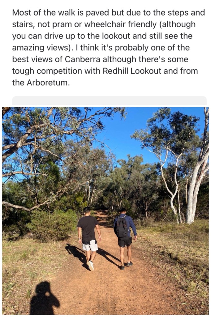 Google maps indicated that getting to the the Mount Ainslie Summit Hiking path was more than doable, and Google reviews talked about the paved pathways and a few stairs.