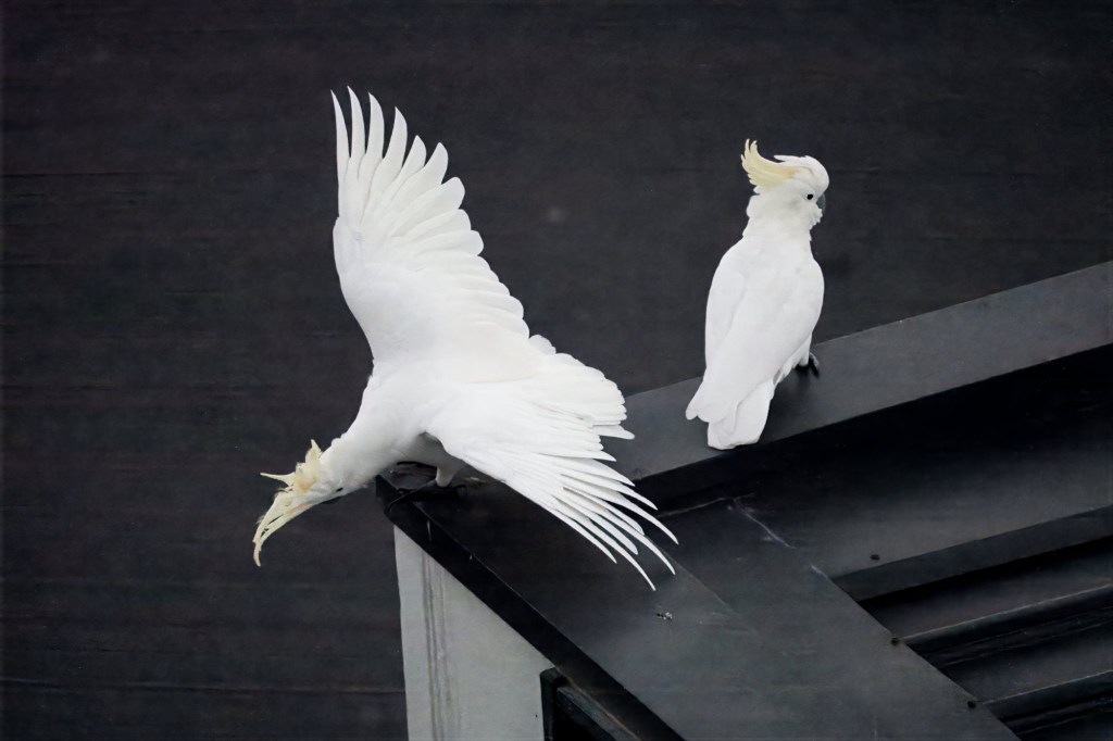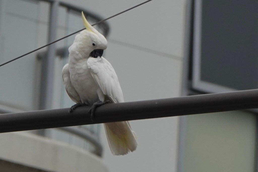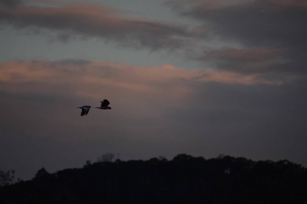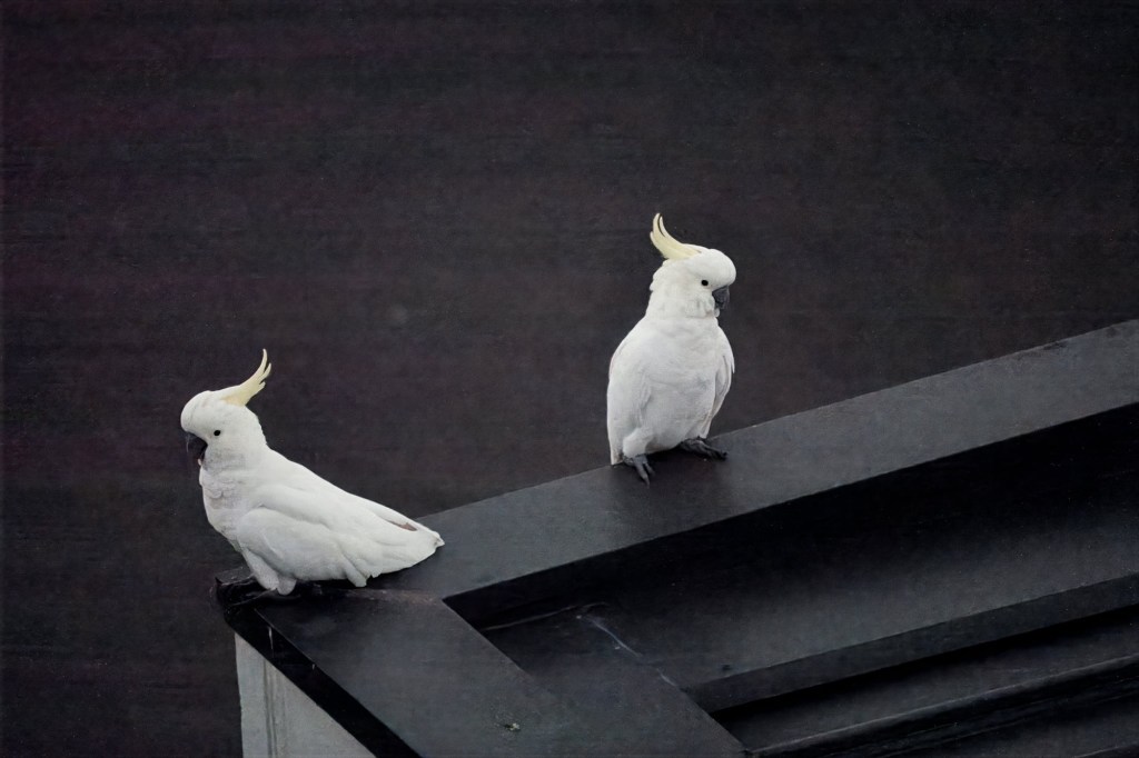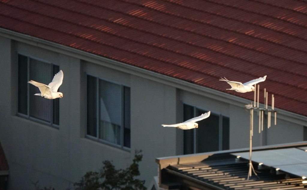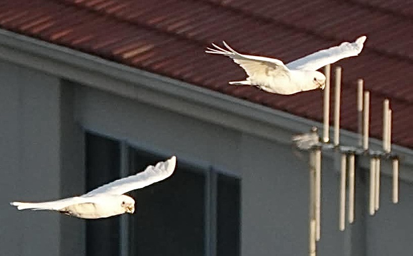As we finished dinner on our balcony, some Little Corellas flew by. They’re smaller (and quieter!) than cockatoos and have no crest.