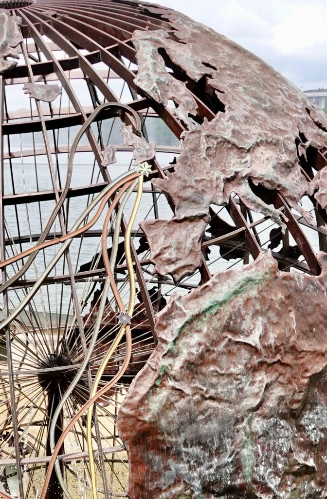 The openwork globe has a fountain inside, effectively making the ocean areas water. Overlaid on the globe are Captain Cook’s expedition routes, each in a different colour.