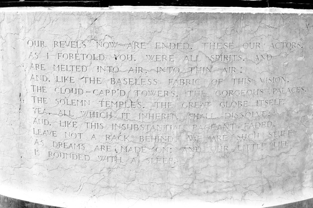 “Our revels now are ended. These our actors, as I foretold you, were all spirits and are melted into air, into thin air: and, like the baseless fabric of this vision, the cloud-capp’d towers, the gorgeous palaces, the solemn temples, the great globe itself, yea, all which it inherit, shall dissolve and, like this insubstantial pageant faded, leave not a rack behind. We are such stuff as dreams are made on, and our little life is rounded with a sleep.“