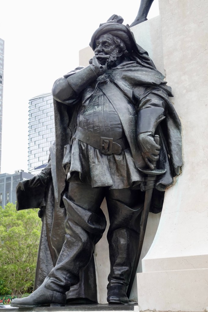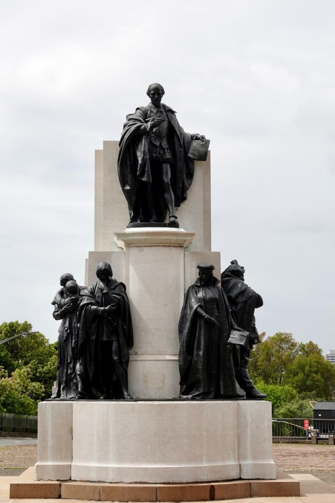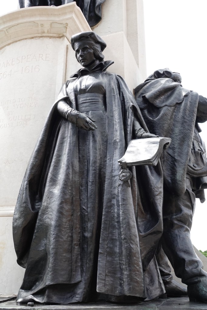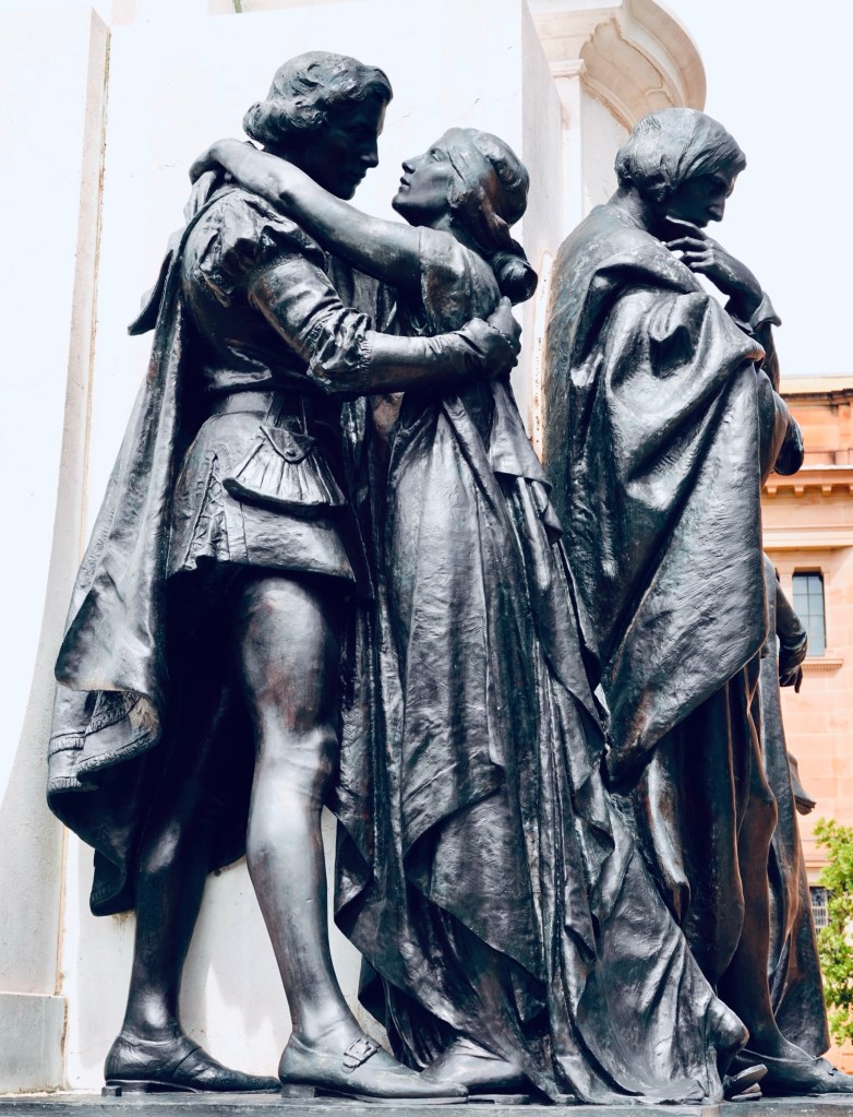 We recognized the figures of Romeo and Juliet, and Falstaff, but I guessed that the other male was a pensive Hamlet and the female figure might be Lady MacBeth. I was wrong on both counts; sculptor Sir Edgar Bertram Mackennal was depicting Othello and Portia.