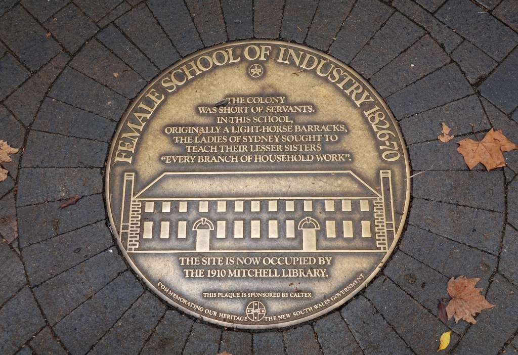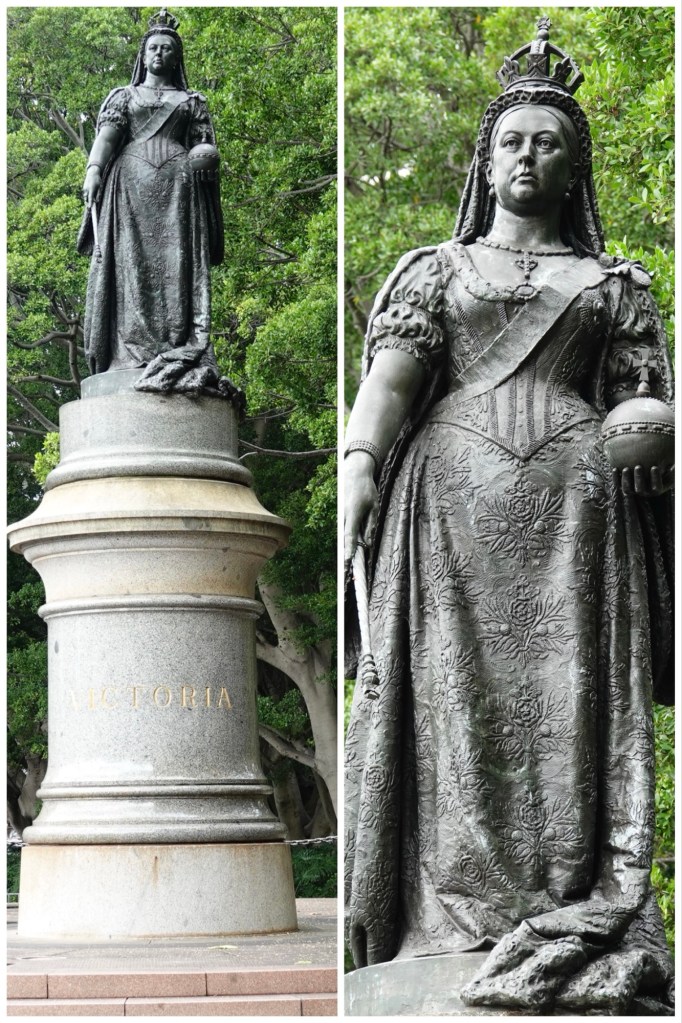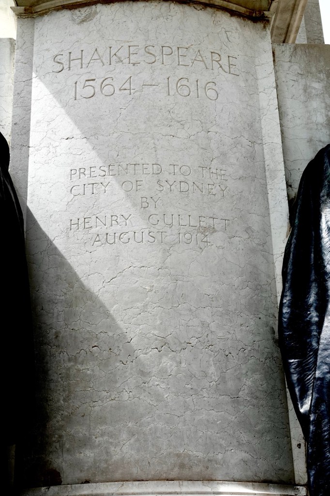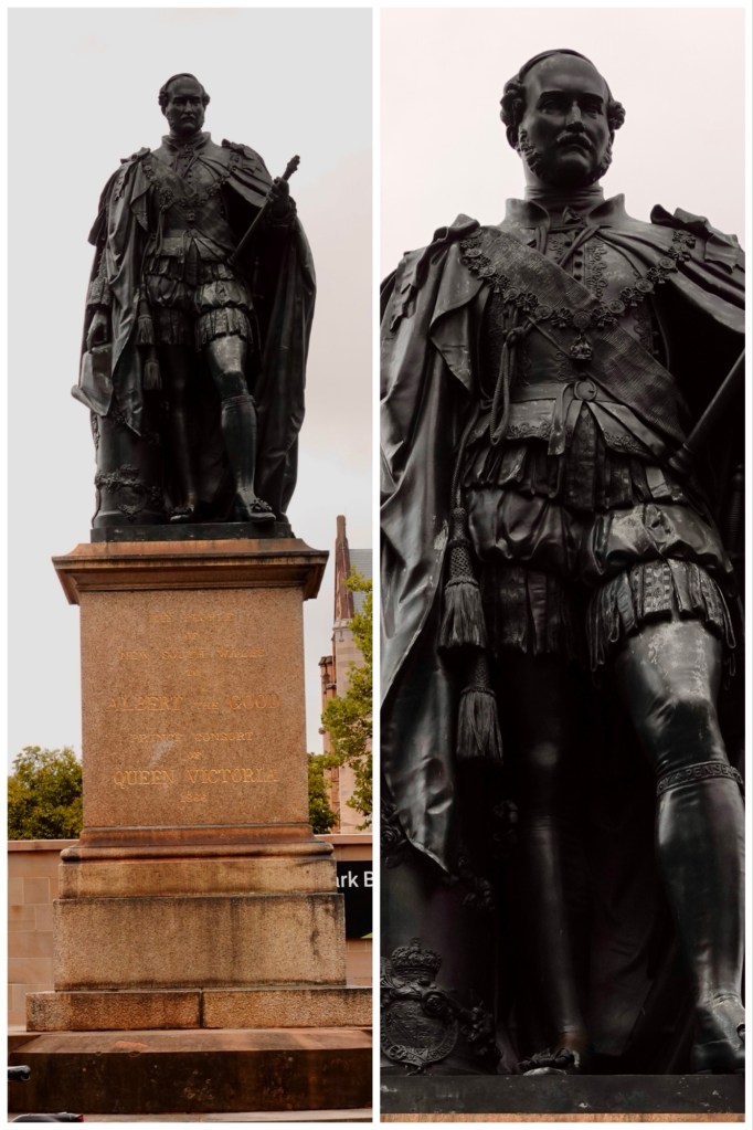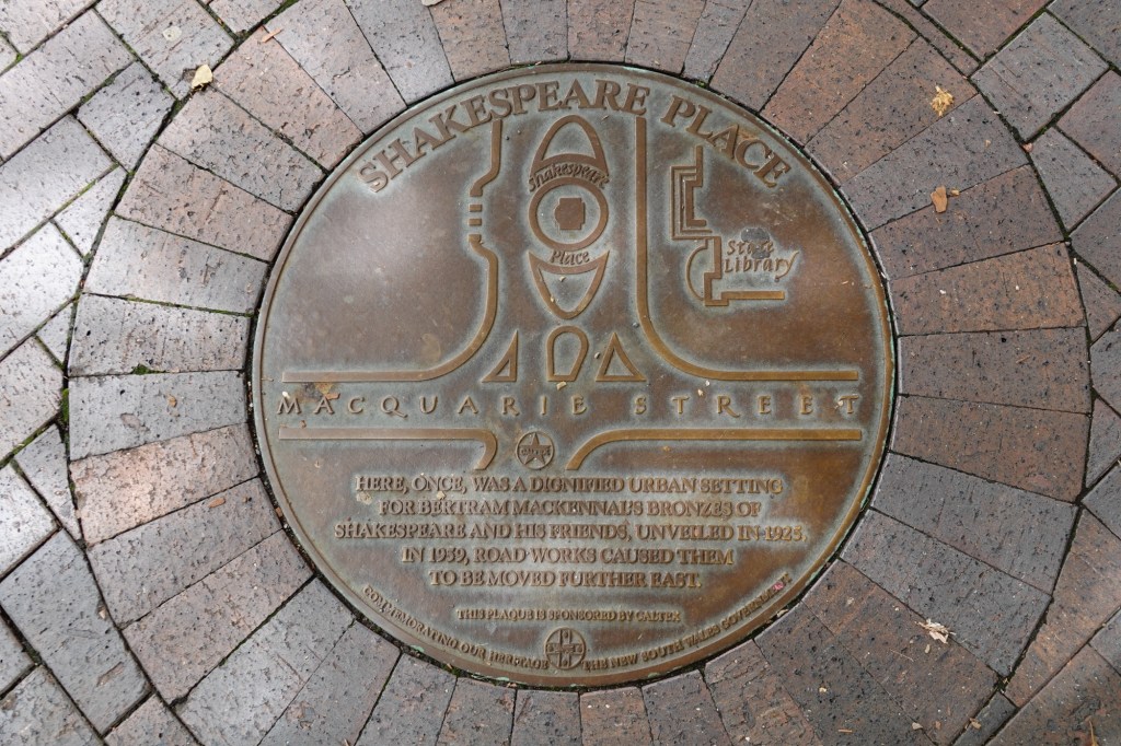 We walked along Macquarie Street, past buildings to which we’ll return later in the week, all the way to its intersection with Shakespeare Place. A marker in the pavement – one of many like it along this street – explained that the statues originally at the corner were moved onto a boulevard in the centre of the widened roadway, where we were able to admire and photograph them.