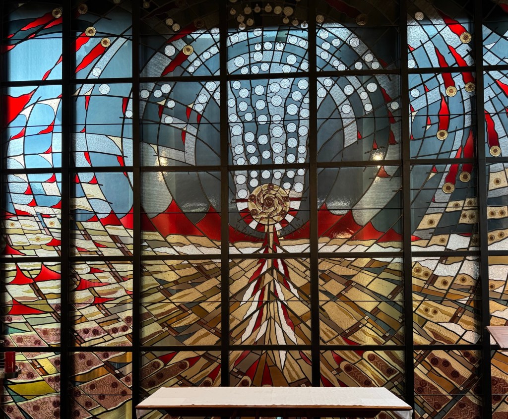 My favourite architectural feature of the church was the (relatively) new glass chapel. By the time Ted got to it the celebration of the Eucharist was being set up, so he didn’t get any photos. I tried, but mine really don’t do it justice.