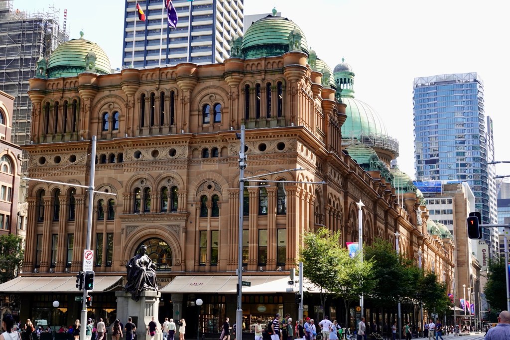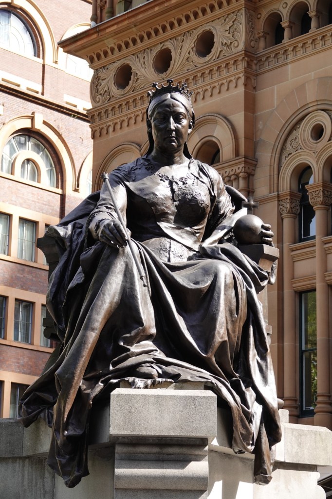Kitty-corner from the QVB, Her Majesty sits and watches shoppers going in and out.