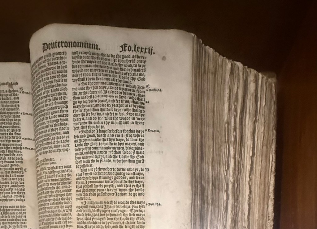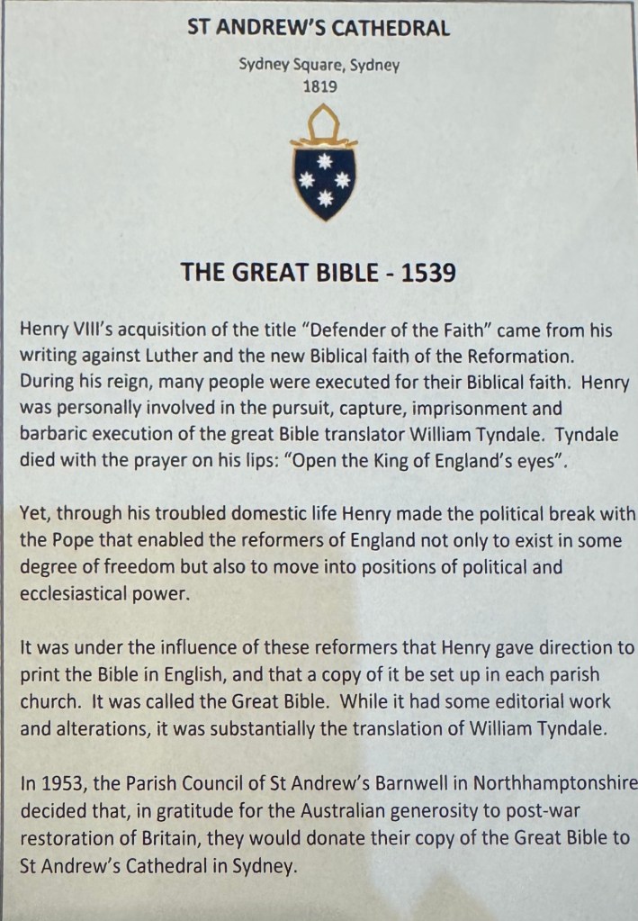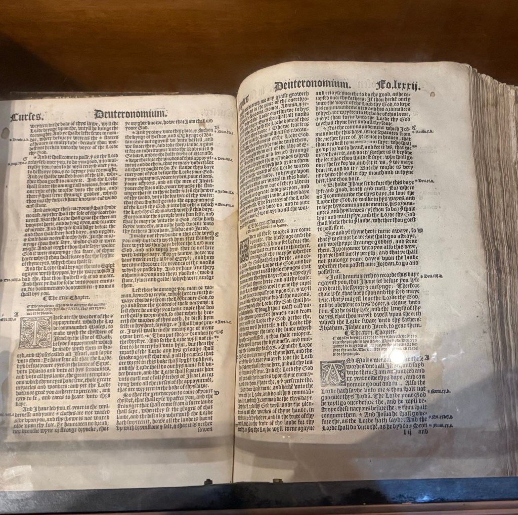 The most impressive item in the cathedral, tucked away in a glass case along one wall, is an edition of the Great Bible of 1539CE.
