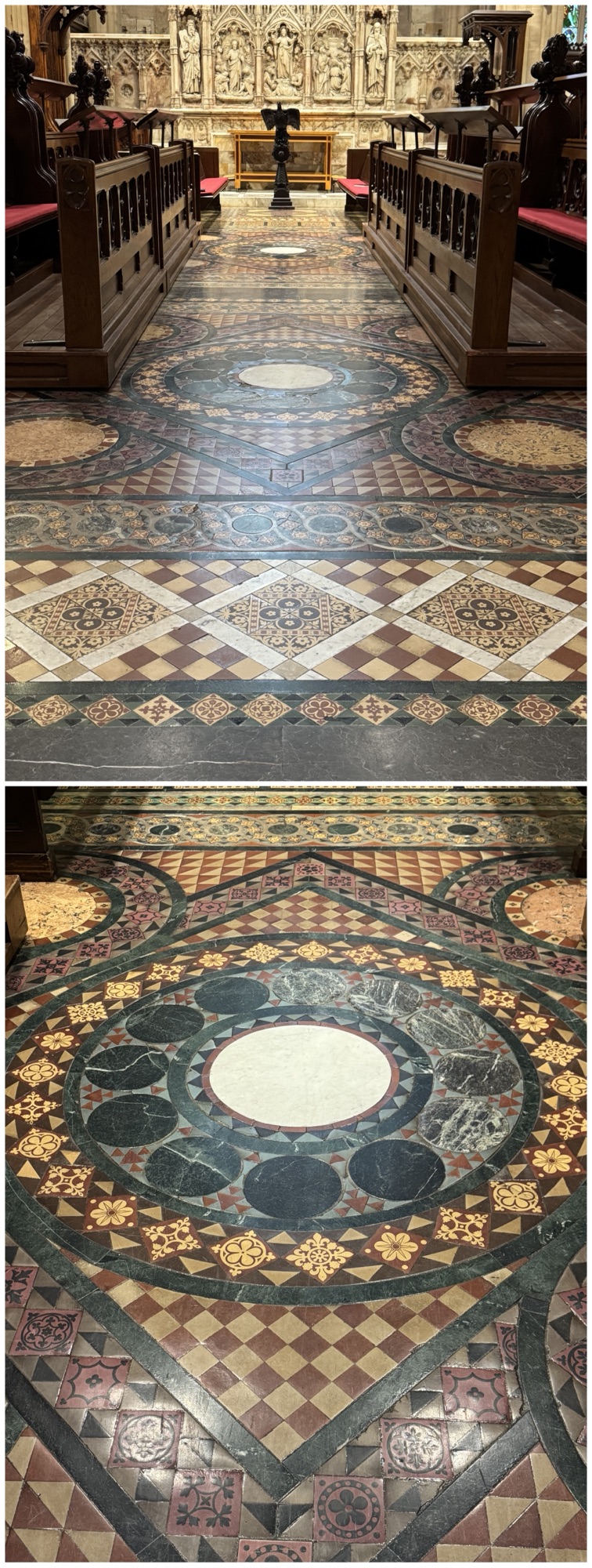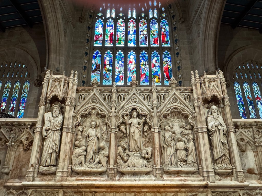 The style of the church is called “Perpendicular Gothic”, which is a way to fit an imposing Gothic Revival style into an area more appropriate for a parish church. Winchester and York Minster in England are also Perpendicular Gothic.