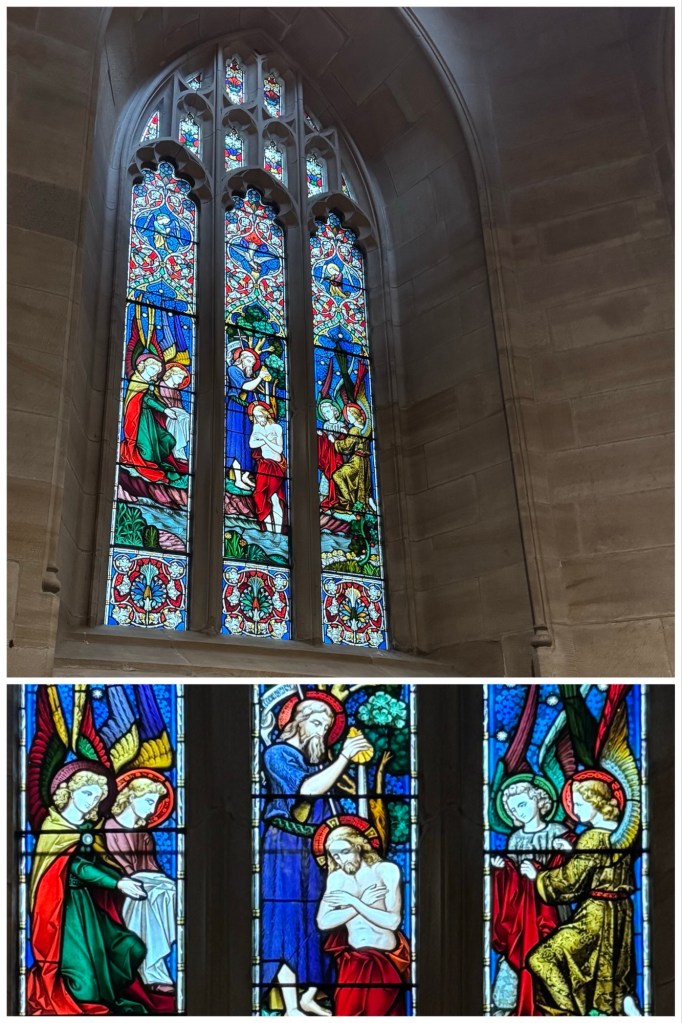 Ted noticed an unusual theme in the stained glass window above the baptismal font: Jesus being baptized in the river by John.