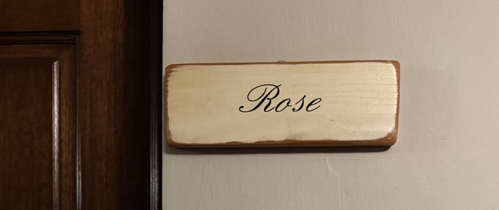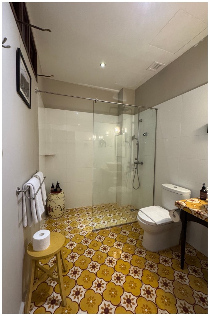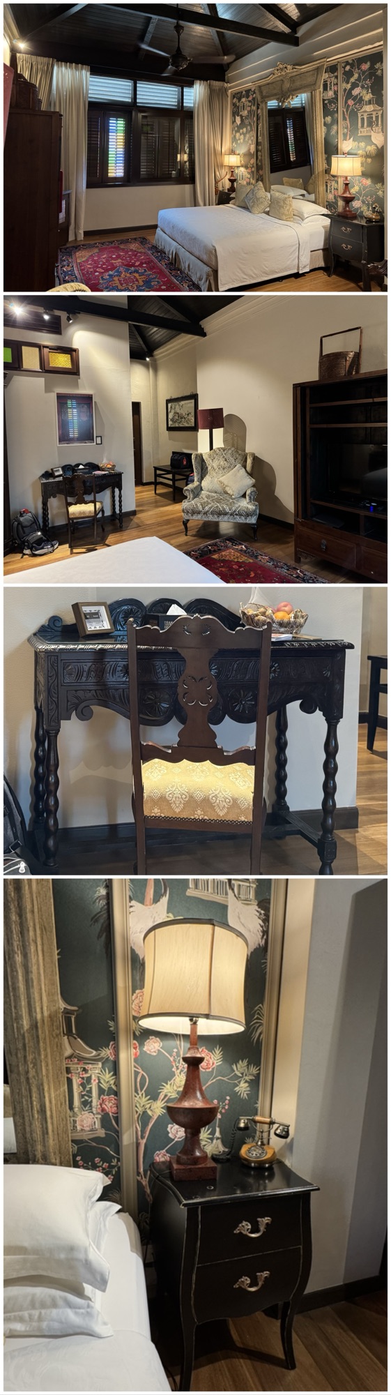 The website described it this way: Rose: A Gorgeous room (32 sqm) with super high ceilings and exposed original beams. The focal point of this room is a huge baroque style mirror behind the sumptuous King Size bed, laid against a background of Rose detailed wallpaper. An eclectic mix of Chinese and European inspired furniture add to the luxurious setting with en-suite bathroom offering salvation from the heat with a powerful walk-in rain shower