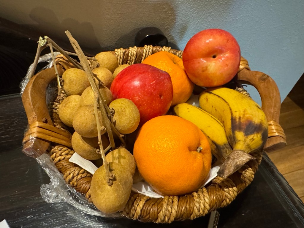 In addition to bottles of filtered room temperature water, there was cold water and iced tea in the mini fridge, and a bowl of fresh fruit on the desk: bananas, plums, lychees, and tangerines.