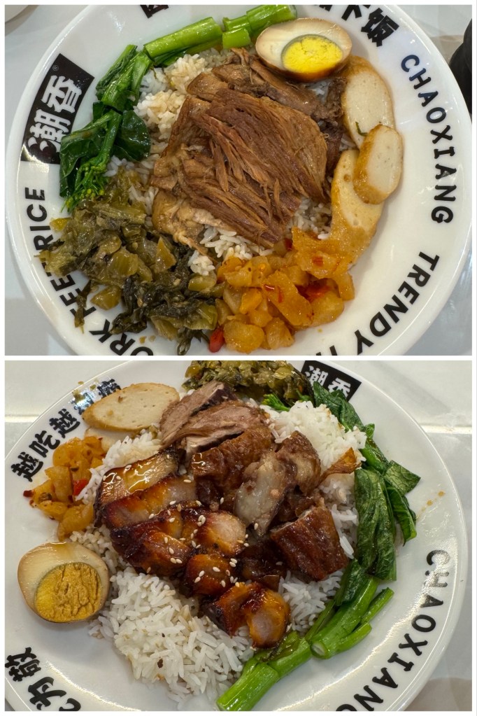 We took his advice and simply ate at the first decent looking hawker stall that also had a few tables away from the road. It specialized in pork and rice. I had Longjiang (Pork Knuckle) Rice (the top photo), and Ted had Guangdong Paired Roast Pork and Barbecue Pork Rice (the bottom photo). Both came with half a Chinese tea egg, a bit of gai lan (Chinese broccoli), some braised bean curd, and a garnish of fermented mustard greens and pumpkin chutney. We added a healthy dollop of chili oil.