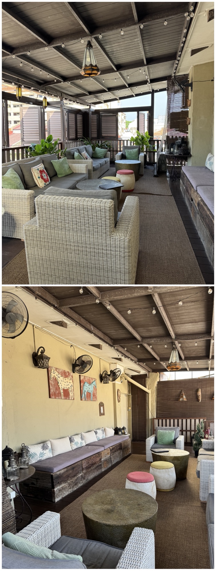 Before leaving us to our own devices, we were shown the terrace, just down the hall from our room. It’s crazy hot here, but there are fans that will make it a nice evening space instead which to relax. Ted’s only criticism of Campbell House so far is that our room only has one upholstered chair, which means that unless one of us sits on the bed, we do our sitting/reading/blogging either elsewhere or separately.